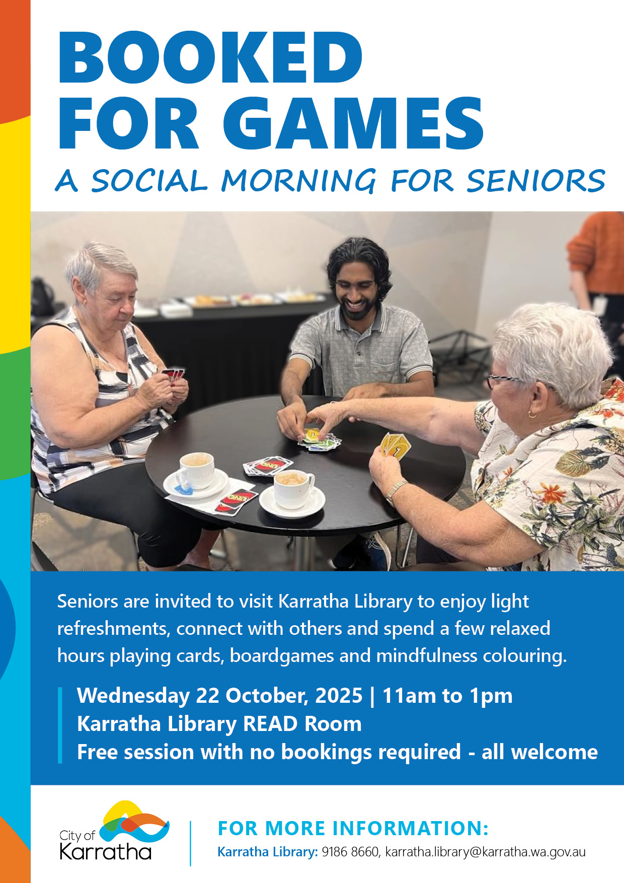 Seniors are warmly invited to Karratha Library for a relaxed morning of games and connection. Enjoy light refreshments while spending time with others over cards, board games, and mindfulness colouring.